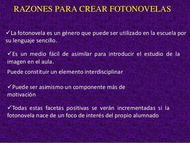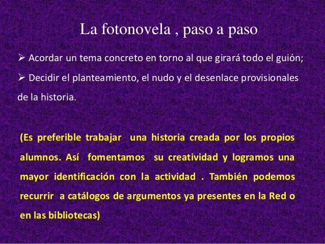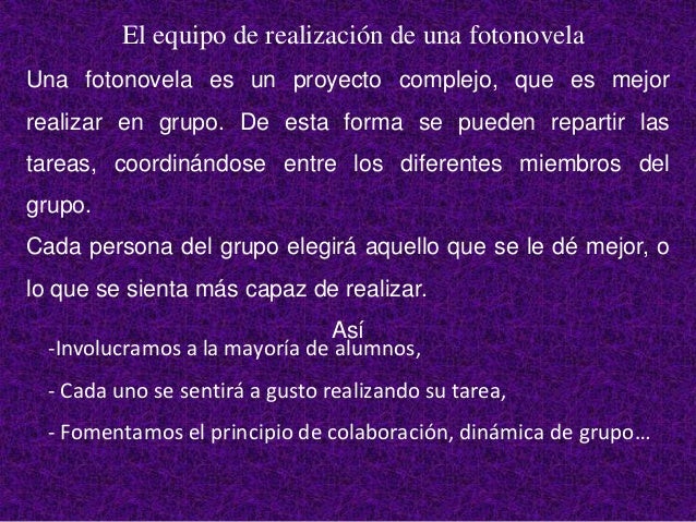 - 10. Una fotonovela es un proyecto complejo, que es mejor realizar en grupo. De esta forma se pueden repartir las tareas, coordinándose entre los diferentes miembros del grupo.Cada persona del grupo elegirá aquello que se le dé mejor, o lo que se sienta más capaz de realizar. Así en el equipo de realización de una fotonovela involucramos a la mayoría de alumnos. Cada uno se sentirá a gusto realizando su tarea, y fomentamos el principio de colaboración, dinámica de grupo…