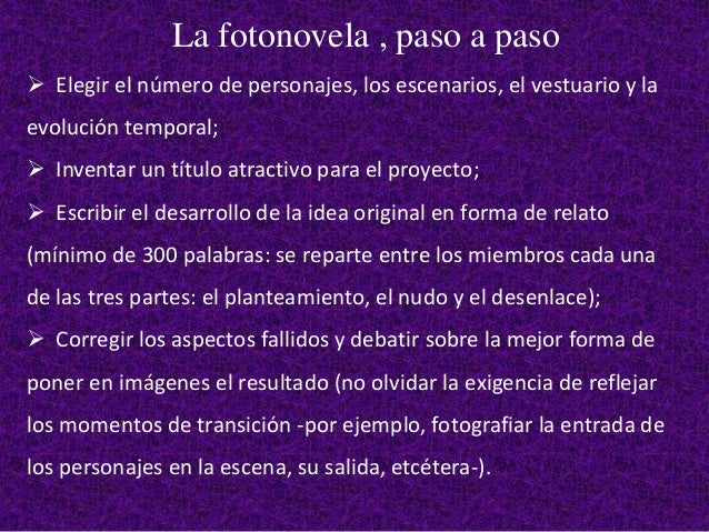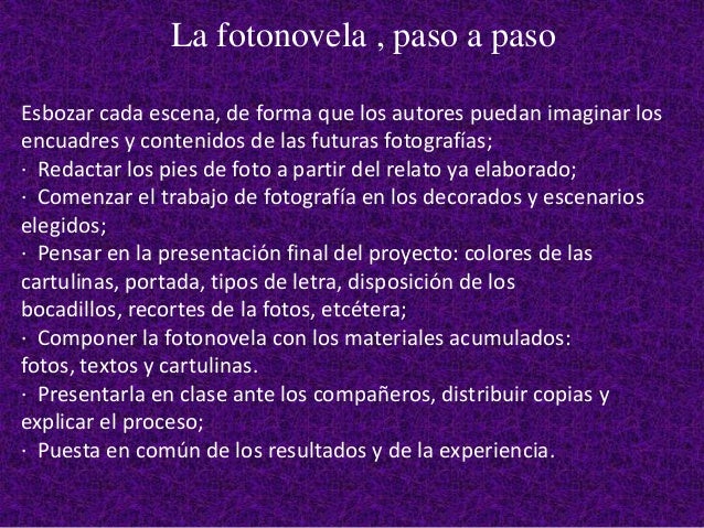 - 9. Esbozar cada escena, de forma que los autores puedan imaginar los encuadres y contenidos de las futuras fotografías;· Redactar los pies de foto a partir del relato ya elaborado;· Comenzar el trabajo de fotografía en los decorados y escenarios elegidos;· Pensar en la presentación final del proyecto: colores de las cartulinas, portada, tipos de letra, disposición de los bocadillos, recortes de la fotos, etcétera;· Componer la fotonovela con los materiales acumulados:fotos, textos y cartulinas.· Presentarla en clase ante los compañeros, distribuir copias y explicar el proceso;· Puesta en común de los resultados y de la experiencia.La fotonovela , paso a paso