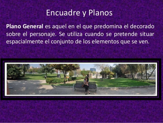 - 11. Plano General es aquel en el que predomina el decorado sobre el personaje. Se utiliza cuando se pretende situar espacialmente el conjunto de los elementos que se ven. Encuadre y Planos.