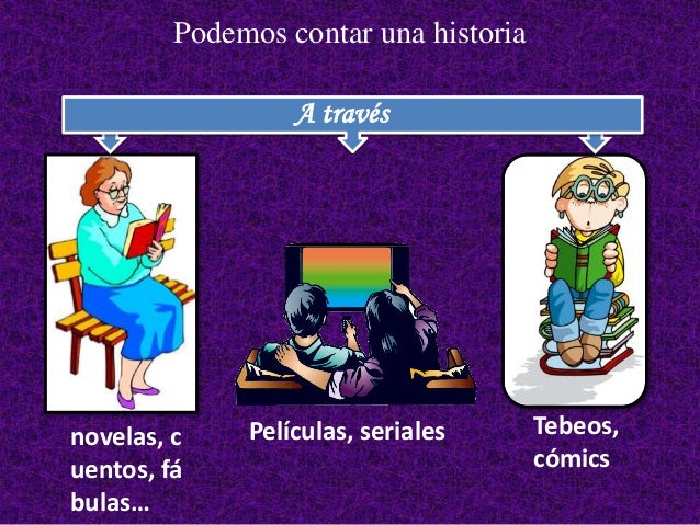 - 2. Podemos contar una historia, novelas, cuentos, fábulas, películas, series, cómics, etc.