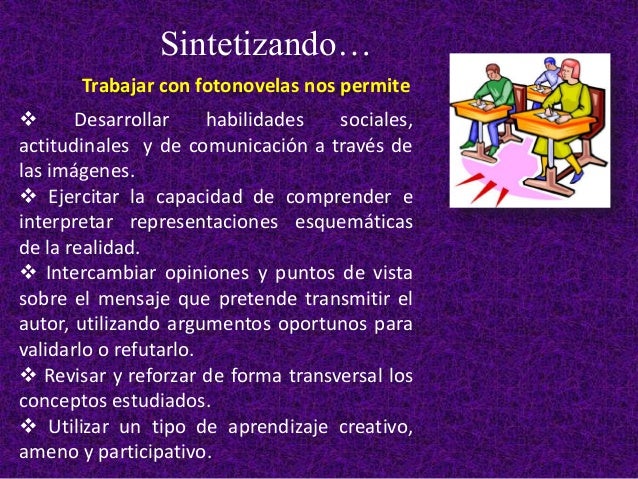 - 16. Sintetizando, trabajar con fotonovelas nos permite: Desarrollar habilidades sociales,actitudinales y de comunicación a través de las imágenes. Ejercitar la capacidad de comprender e interpretar representaciones esquemáticas de la realidad. Intercambiar opiniones y puntos de vista sobre el mensaje que pretende transmitir el autor, utilizando argumentos oportunos para validarlo o refutarlo. Revisar y reforzar de forma transversal los conceptos estudiados. Utilizar un tipo de aprendizaje creativo, ameno y participativo.