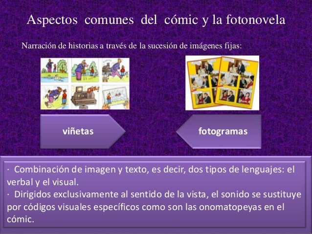 - 5. Tiene aspectos comunes del cómic, una combinación de imagen y texto, es decir, dos tipos de lenguajes: el verbal y el visual.· Dirigidos exclusivamente al sentido de la vista, el sonido se sustituye por códigos visuales específicos como son las onomatopeyas en el cómic.Narración de historias a través de la sucesión de imágenes fijas: fotogramas viñetas.
